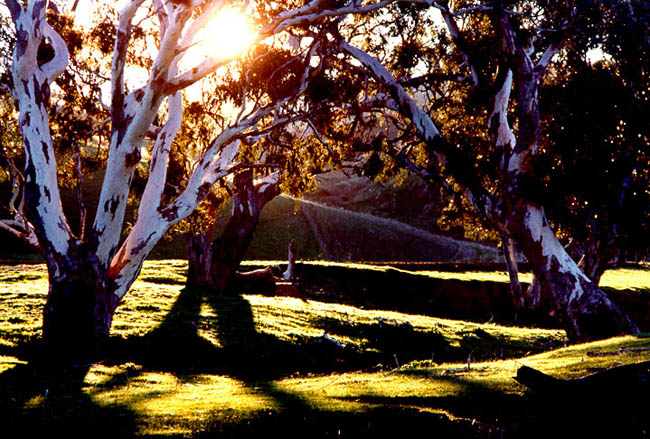 Description: The beautiful River Ghost Gums silhouetting against the setting sun near the upper reach of the Maribyrnong River, Victoria.