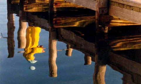 Description: Abstract reflection of my son Paul fishing on a jetty in Metung, Victoria, Australia. Poem: Morning fresh and calmReality or illusion?The lone fisherman Go back