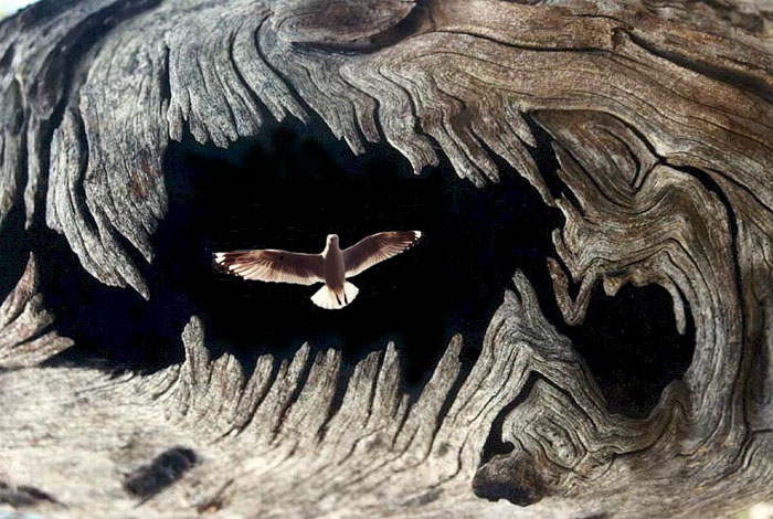 Description: A composite photograph of a sea gull and a dead tree trunk looking like a 'jaw' of a beast.