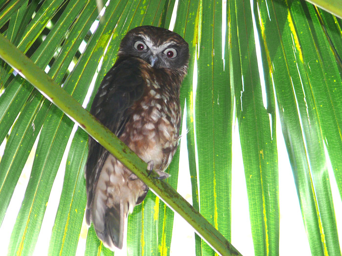Due to the rain and increased food supply in the forest, the boobok owls have returned to the Cumberland State Forest for the first time after many years of absence. This is a photograph of a boobok owl roosting on a Cabbage-tree Palm