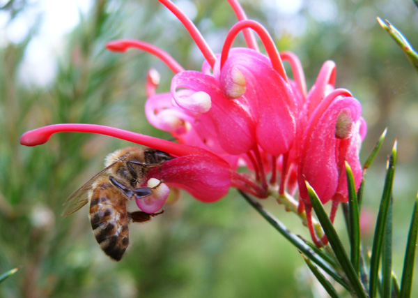 The arrival of Spring, a bee busy gathering nectar from the Grevillea flower in the Cumberland State Forest.